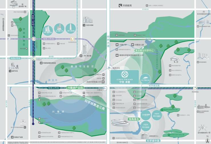 成都科学城黄金三角由“一中心二极低、一岛三园”七大功能组团组成。其核心发展区是由兴隆湖高端技术产业园、鹿溪智谷科学中心、独角兽岛三个板块构成,打造科学城产业“黄金三角区”。