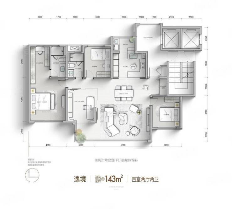 143㎡户型:四室两卫,LDKB方正厅设计,43㎡客厅连通12㎡生活阳台,主打高性价比与功能性,适合三口之家。