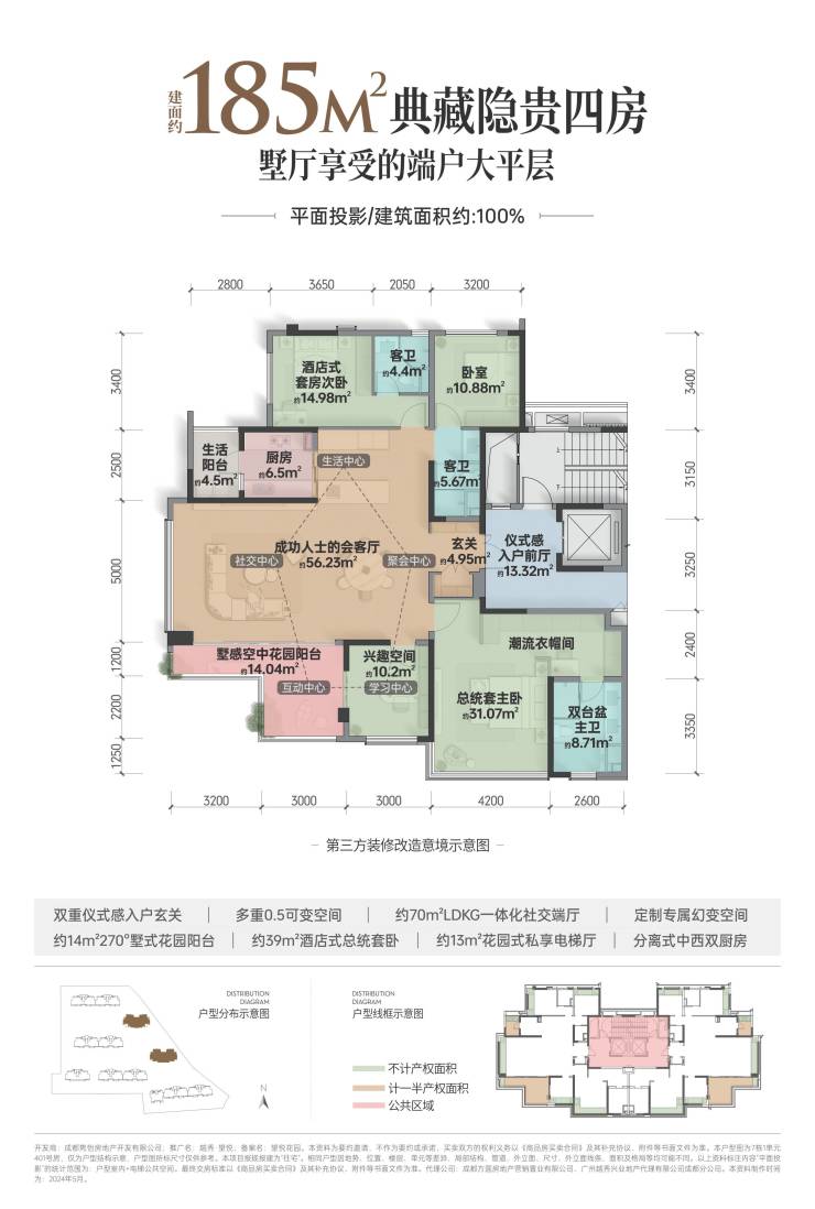 功能亮点:双入户玄关(16.4㎡光厅+独立家政阳台),主卧套房(约30㎡)配备270°视野,最小房间可容纳1.8米床+衣柜。