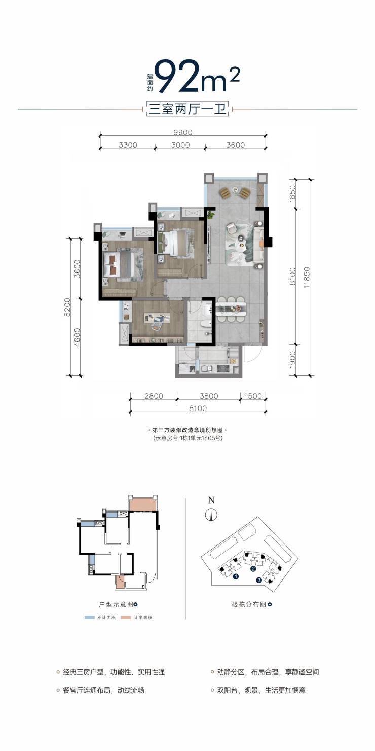 采用半围合式建筑布局,打造约5000㎡中央景观园林,实现超宽楼间距,保障户户采光通风